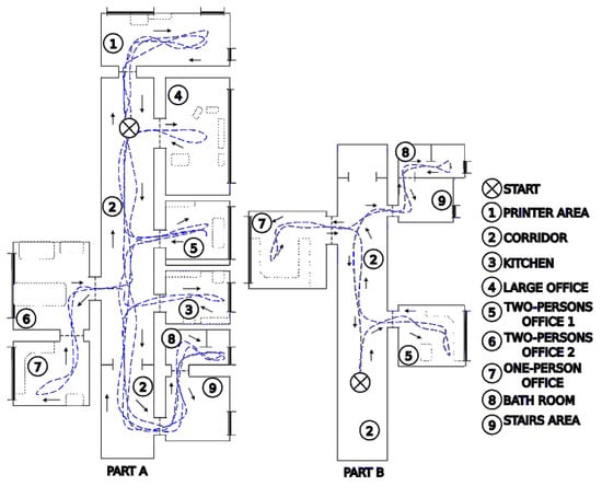 Maps of the two parts of the laboratory in Freiburg with approximate paths followed by the robot during data acquisition (map and trajectories data adopted from the COLD dataset web page https://www.cas.kth.se/COLD/cold-freiburg.html).
