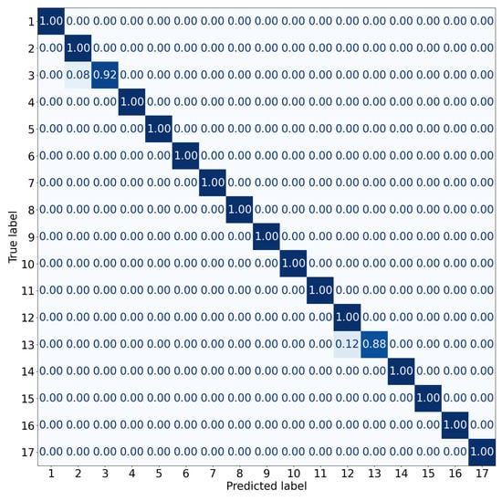As defined in Section 4, in Experiment 1, appearance-based localization was conducted for 17 sections, each of them containing several image acquisition locations, and being a description of a larger corridor space. The best network training results were obtained for the unfrozen last 50 layers of the backbone CNN, a learning rate of , and a batch size of 16, with a learning error of 0.1605, learning accuracy of 0.9596, validation error of 0.1183, and validation accuracy of 0.9796 (Figure 9).