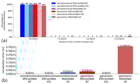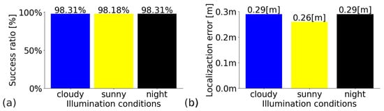 In order to explore the generalizability of the proposed system to other environments, we also demonstrate localization results for the Saarbrücken sequence from the COLD dataset. This is a sequence of images collected in a different location within a building having different characteristics than the one used for the Freiburg sequence [20]. Both Freiburg and Saarbrücken sequences from the COLD dataset were used in the research on mobile robot’s localization presented in [32], although the inaccurate description of the dataset used in this paper does not allow us to replicate the Saarbrücken sequence experiment for direct comparison, as it was accomplished for the Freiburg sequence used in [43]. Therefore, considering the analysis of the influence of an imbalanced training dataset on the localization accuracy of the system, it was decided to use only part B of the Saarbrücken sequence, since it is the only one with images for all weather and lighting conditions. The results presented in Figure 16 confirm that our approach generalizes well to different indoor environments, achieving a similar success rate of image retrieval and a similar average localization accuracy as the Freiburg sequence.