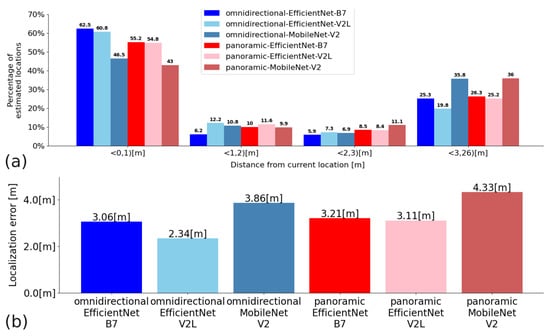 In this experiment, the collected set of images was used to compare the quantitative results of place recognition for panoramic and omnidirectional images for three different CNN architectures: EfficientNet B7 [61], EfficientNet V2L [62], and MobileNetV2 [48]. Moreover, to investigate different strategies for creating the reference database (global map), the dataset was tested in three different configurations: