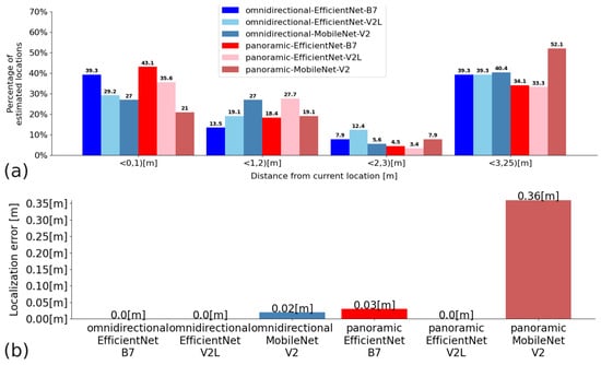 Following the methodology of replicating the selected experiments from [43] with respect to the used images, we achieved the following results for appearance-based localization using embeddings with EfficientNet V2L: for cloudy days, for sunny days, and for nights. The full quantitative results are presented in Figure 15. Thus, better accuracy of room recognition was obtained for cloudy days by , by for sunny days, and by for images recorded at night. The average distance measurement error for the room was also analysed, and the results obtained are presented in Figure 15b. The proposed solution achieved a smaller average distance measurement error than in [43] for cloudy days by m, and by m for sunny days; only for images taken at night was the average error increased by m.