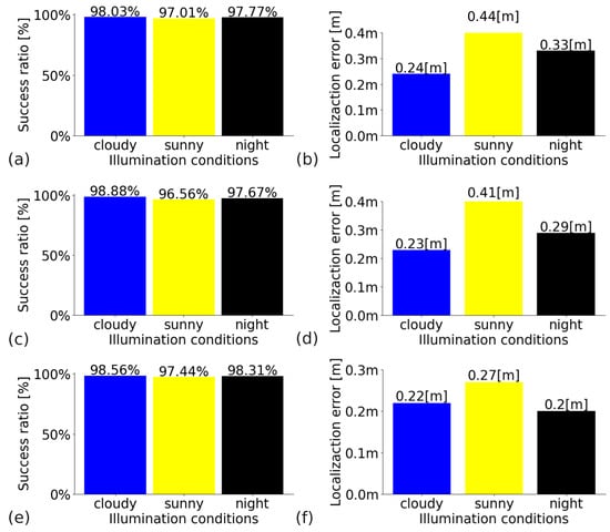 Success ratio for EfficientNetV2L and the set of embeddings acquired from the training set for the room search task for the COLD Freiburg dataset. The result obtained under cloudy (blue), night (black), and sunny (yellow) conditions for the model learned on the training set, namely, a set of images on cloudy days (a), a set of images on cloudy days extended by missing acquisition locations found in images for sunny days and night (b), and a balanced set of images obtained on cloudy and sunny days and at night (c). Average location error in meters for a set of images on cloudy days (d), a set of images on cloudy days extended by missing acquisition locations found in images for sunny days and at night (e), and a balanced set of images obtained on cloudy and sunny days and at night (f).