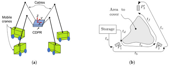 A CDPR with three mobile cranes for search and rescue operations is shown by [35], where each mobile base consists of a reconfigurable telescopic boom that can rotate (Figure 1a). The cable is mounted from the tip of the telescopic arm to the end effector. Although the cranes are fixed, the system can be reconfigured to increase the working space and keep the system in static equilibrium. The objective of this study is to compare the stress distribution and the size of the working space when applying payloads.