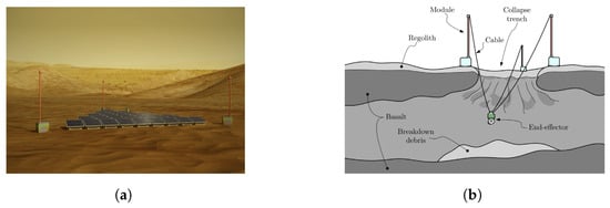 Applications of modular CDPR. (a) Maintenance of large ground solar array. Obtained from [36]. (b) Exploration of lava tubes on celestial bodies. Obtained from [36].
