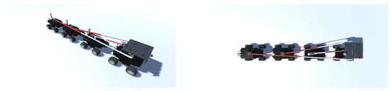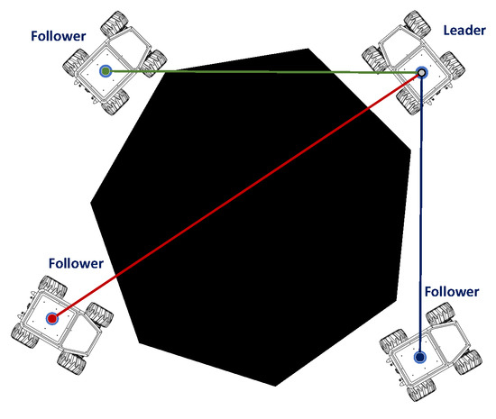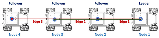 In this phase, the four robots are formed in a worm configuration consisting of four nodes and three edges (Figure 7). For navigation, the strategy used is to assign the front robot as the leader, and the others as followers. Each robot is assigned the fleet route, and minimum distance constraints are added to avoid collisions between them.