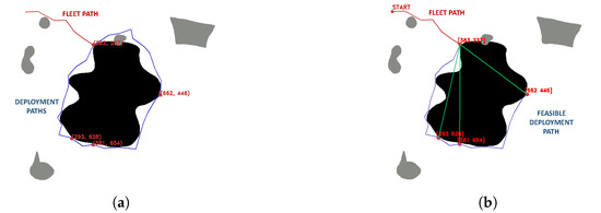 Deployment procedure, (a) definition of fleet path (red) in node-edge configuration and deployment path (blue) in individual configuration, (b) feasible deployment configuration with roped restrictions. Source: Authors.