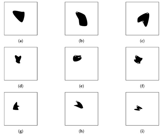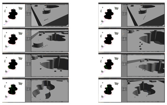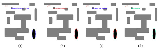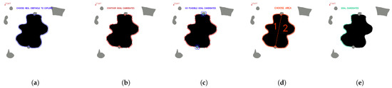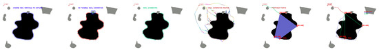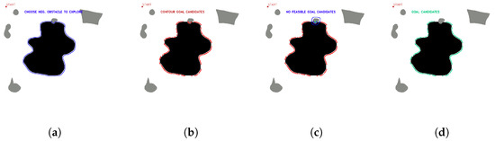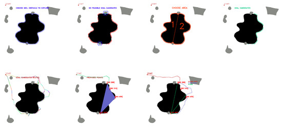 OpenCV tools are used for contour detection, obstacle inflation (erode and dilate tools), and graphical representation of the algorithm. The starting point of the mission and the negative obstacle to be explored are manually selected. The existence of positive obstacles near the undercut that affect the roped deployment process is evaluated, and a group of candidate points is automatically obtained. Figure 8 shows the candidate point selection process for maps with several positive obstacles and one negative obstacle.
