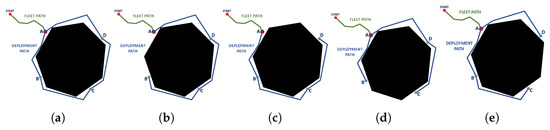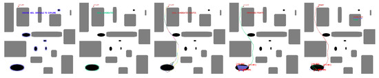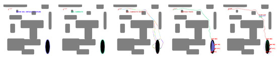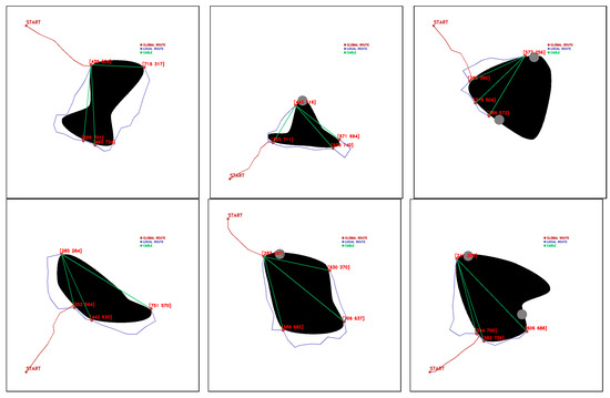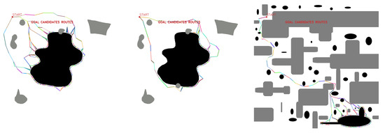 Then, path planning is performed with a multi-query planner, in this case, a probabilistic roadmap (PRM), in order to obtain the candidate fleet routes from the starting point to the candidate target points of the first stage (Figure 11).