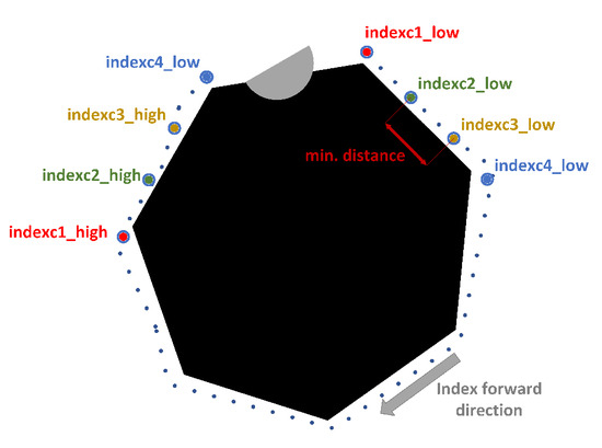 At this stage, the distance cost of the fleet route is minimized and the area covered by the polygon formed by the combination of four points corresponding to the position of the mobile robots is maximized. The candidate points are defined as , , , . Initially, to reduce the number of combinations to be processed, a minimum distance criterion is applied between subsequent points, defining minimum and maximum indices for each point in the general list of candidates, as shown in Figure 12, from which different vectors are obtained for each candidate point.