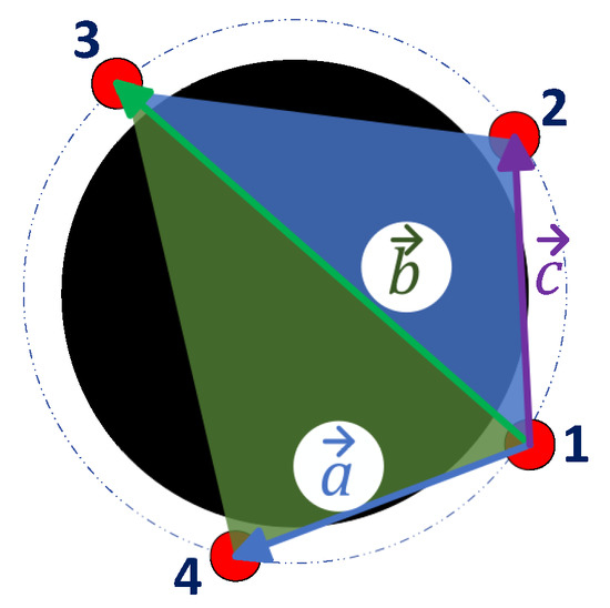 The calculation of the area covered by the combination of the candidate points is made with the sum of the areas of the triangles that form the quadrilateral 1-2-3-4, shown in Figure 13, with the Equation (1):