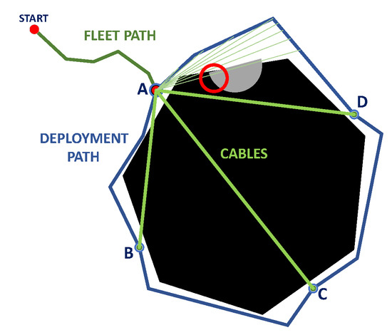 As explained in Section 1, the strategy proposed to perform the deployment of the MCDPR must assure the traversability of a path for the mobile bases from a start point to the surrounds of the sinkhole, considering that the robots are attached by ropes that cannot pass through positive obstacles. After that, using optimization techniques, a feasible configuration that minimizes the fleet path distance cost and maximizes the area of the region of interest (ROI) to be covered must be found.