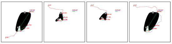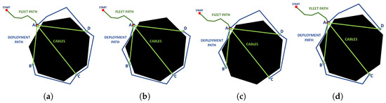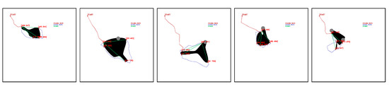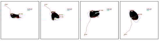 Through the optimization of the fitness function, the target points are obtained, with which the deployment routes between them are planned (Figure 5a); subsequently, the feasible deployment routes are evaluated, avoiding collisions of the ropes with positive obstacles near the sinkhole to be explored (Figure 5b). Finally, the mission is executed in the simulator, adding a 2D display of the roped fleet.