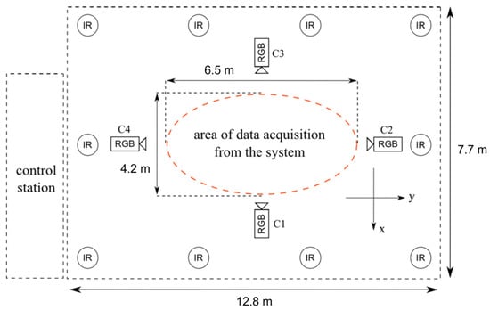 Camera setup for video and Vicon motion capture data collection [32]. (Remarks: RGB: digital video camera, IR: motion capture camera).