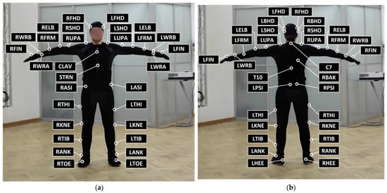 Retroreflective spherical marker placement on the anatomical landmarks of the healthy individual for (a) front view, (b) back view [32].