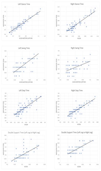 Table 3 indicates that no significant differences existed in stance time (left and right), swing time (left), step time (left and right), and double support time (left leg switched to right leg) between the two systems, as the significance (2-tailed) values from the independent samples t-tests exceeded the significance level of 0.05. However, significant differences existed in swing time (right) and double support time (right leg switched to left leg), as the significance (2-tailed) values were below 0.05. The Pearson correlation and intraclass correlation coefficient tests were significant at the 0.01 level (2-tailed) for all temporal gait parameters. For stance time (left and right) and step time (left and right), the Pearson correlation coefficient was good (ranging from 0.839 to 0.945), while it was moderate for swing time (left and right) and double support time (left leg switched to right leg and right leg switched to left leg) (ranging from 0.522 to 0.724). The intraclass correlation coefficient was excellent for stance time (left) (0.945), good for stance time (right) and step time (left and right) (ranging from 0.832 to 0.857), and moderate for swing time (left) and double support time (left leg switched to right leg and right leg switched to left leg) (ranging from 0.510 to 0.624) but weak for swing time (right) (0.469). The scatter plots in Figure 8 indicate that there was a linear increase in the temporal gait parameters obtained from the MediaPipe Pose system with those obtained from the Vicon motion capture system for all gait cycles. This suggested a positive association between the two systems, as shown in Figure 8. The correlation between the MediaPipe Pose system and the Vicon motion capture system was found to be strong for stance time and step time, but only moderate for swing time and double support time.