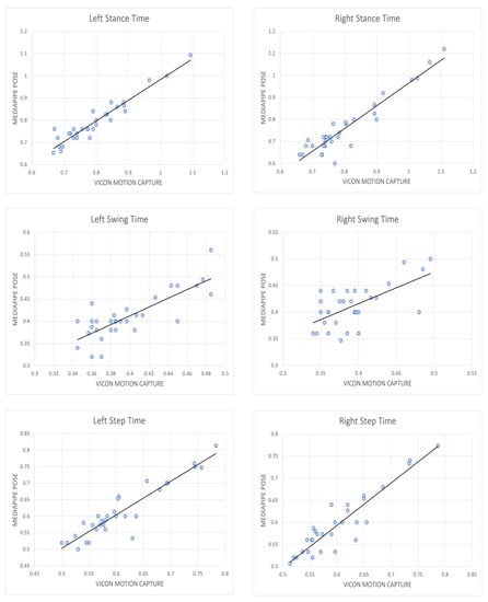 Table 5 reveals that there were no significant differences in stance time (left and right), swing time (left and right), step time (left and right), and double support time (left leg switched to right leg) between the Vicon moCap and MediaPipe Pose systems, as the significance (2-tailed) values from the independent samples t-test were greater than the significance level of 0.05. However, there was a significant difference in double support time (right leg switched to left leg) between the Vicon moCap and MediaPipe Pose systems, as the significance (2-tailed) value was less than 0.05. The Pearson correlation and intraclass correlation coefficient tests were significant at the 0.01 level (2-tailed) for all temporal gait parameters. The Pearson correlation coefficient was good for all the temporal gait parameters (ranging from 0.802 to 0.955), except for swing time (right), which was rated as moderate (0.635). The intraclass correlation coefficient was excellent for stance time (left) and step time (left and right) (ranging from 0.923 to 0.956), good for stance time (right), swing time (left), and double support time (left leg switched to right leg) (ranging from 0.765 to 0.893), while it was moderate for swing time (right) and double support time (right leg switched to left leg) (ranging from 0.551 to 0.579). The scatter plots in Figure 9 indicate that there was a linear increase in the temporal gait parameters obtained from the MediaPipe Pose system with those obtained from the Vicon motion capture system for the means of each healthy individual. This suggested a positive association between the two systems, as shown in Figure 9. The correlation between the MediaPipe Pose system and the Vicon motion capture system was found to be strong for all temporal gait parameters, except left swing time, right swing time, and double support time (right leg switched to left leg).