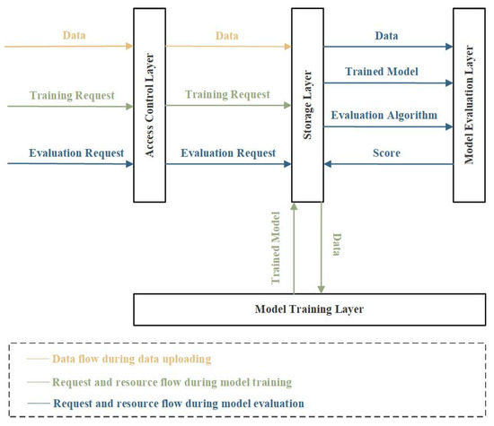 In order to address the untrustworthy issues involved in training, sharing, and evaluation during model evaluation in current DL research, a blockchain-based trustworthy model evaluation framework for DL is proposed. The framework consists of an access control layer, a storage layer, a model training layer, and a model evaluation layer, as shown in Figure 2. In the following, each layer will be described in detail. The functions used in algorithms can be found in Table 4. Hereafter, we refer to the data and models as resources, which are distinguished when necessary, and refer to the model performance evaluation results as scores.