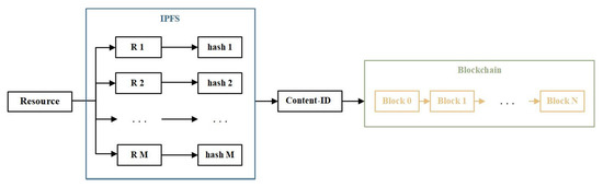 Resource files will occupy a large amount of storage space. With the increasing of nodes and transactions in the blockchain, the storage burden will gradually increase, resulting in difficulties for subsequent nodes to join the blockchain and limitations on the throughput rate. To alleviate the storage pressure on the blockchain and improve searching efficiency, an off-chain auxiliary storage method based on the InterPlanetary File System (IPFS) [63] is adopted. The IPFS is a content-addressed distributed file storage protocol with good security and high transmission speed. A file uploaded to the IPFS is split into small chunks, and these chunks and their hash values are stored on nodes across the network. The IPFS returns a unique hash value for each file, which is referred to as the Content-ID () of this file in this paper. Users can download files from the IPFS from multiple servers simultaneously. Even if one node is temporarily offline, users can immediately switch to other nodes, avoiding resource loss and single-point-of-failure issues caused by network failures and other problems. Due to the content-addressable nature of the IPFS, the of each file is independent of server locations, the file name, etc. Furthermore, hash functions provide collision resistance, making it difficult for an attacker to steal a file from the IPFS as long as its has not been leaked. In the proposed framework, the resources are stored in the IPFS. To enable effective and secure resource sharing among the users, the of each resource is encrypted and stored in the blockchain ledger. The storage process of a single resource file from the IPFS to the blockchain is illustrated in Figure 3.