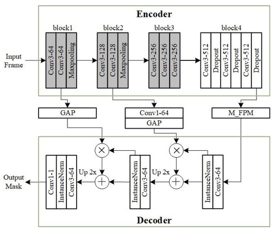 Architecture of FgSegNet_v2 [45] (Convi-j: j convolutions of i × i; GAP: global average pooling; M _ FPM: feature pooling module; InstanceNorm: instance normalization. Boxes filled with gray indicate layers that are frozen during training).