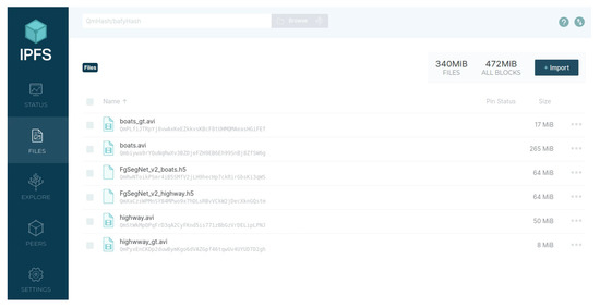 User2 requested to train models using the data “highway” and “boats” separately. After passing the access control verification, User2 downloaded the data “highway” and “boats” to the local sever, and trained the FgSegNet_v2 model using the data “highway” and “boats” as training datasets, respectively, resulting in the models FgSegNet_v2_highway and FgSegNet_v2_boats. Finally, User2 uploaded these two trained models to the storage layer of the MEF. Taking FgSegNet_v2_boats as an example, its storage status in the IPFS can be seen in Figure 5, and its storage structure in the blockchain is