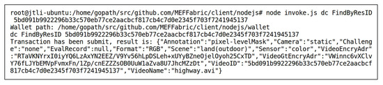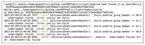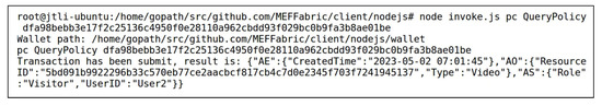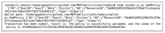 After the data “highway” and “boats” were stored in the storage layer of the MEF, User1 added access control permissions for User2 to access the data “highway” and “boats” by invoking the method of the smart contract PC of the access control layer. Figure 7 shows User1 adding access control permission for User2 to access the data “highway”, with the in Figure 7 matching the in Figure 6. Figure 8 demonstrates the method of the smart contract PC being used to verify the successful addition of the above access control policy. During the query, the index of the access control policy stored in the blockchain was used as the input after , as described in Section 3.1. The query result displays the complete access control policy added in Figure 7, indicating that the operation in Figure 7 was successful.