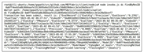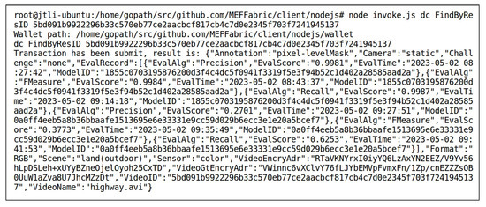 User1 submitted a model evaluation request. After the access control verification was passed, User1 obtained the FgSegNet_v2_highway model, then evaluated the performance of the FgSegNet_v2_highway model using the data “highway” and “boats”, respectively, using Precision, Recall, and F-Measure as evaluation algorithms. This evaluation process generated six score records. Once the evaluation was complete, the score records were automatically uploaded to the blockchain. User2 also submitted a model evaluation request. After the access control verification was passed, User2 obtained the data “highway” and “boats”, then evaluated the performance of the FgSegNet_v2_boats model using the data “highway” and “boats”, resectively, using Precision, Recall, and F-Measure as evaluation algorithms. This evaluation process also generated six score records. Once the evaluation was complete, the score records were automatically uploaded to the blockchain. All the above evaluations and score recording processes were implemented by the method of the smart contract DC. Figure 11 and Figure 12 respectively show the results of querying the records of the FgSegNet_v2_boats model and the data “highway” using the method of the smart contract DC after the model evaluation was completed. The retrieved key-value pairs were sorted alphabetically. It can be observed that the scores corresponding to the models and data were recorded in their attribute. The for the model is , and the for the data is . For the FgSegNet_v2_boats model, when the is “”, the data used to evaluate the model is “highway”, and the evaluation setting is the SIE. Therefore, the scores generated by the three evaluation algorithms are not high, with values of , , and , respectively. When the is “”, the data used to evaluate the model is “boats”, and the evaluation setting is the SDE. In this case, the scores generated by the three evaluation algorithms are relatively high, all of them being . The evaluation under the SIE setting measures the model’s cross-scene transferability. The scores under different evaluation settings form a trustworthy model performance evaluation. For the data “highway”, when the is “”, the model used for evaluation is FgSegNet_v2_highway, and the evaluation setting is the SDE. Therefore, the scores generated by the three evaluation algorithms are relatively high, with values of , , and , respectively. When the is “”, the model used for evaluation is FgSegNet_v2_boats, and the evaluation setting is the SIE. In this case, the scores generated by the three evaluation algorithms are relatively low, consistent with the evaluation records of the FgSegNet_v2_boats model using the data “highway” mentioned above. The evaluation records of the video reflect the difficulty of conducting MOS for this video. If all models perform poorly in segmenting the video under the SIE setting, it indicates that there are challenges in conducting MOS on this video, and further research is needed.