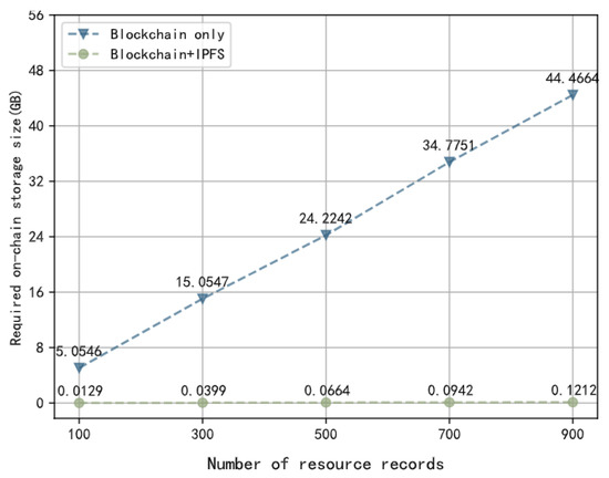A simulation experiment was conducted to validate the performance of the storage strategy adopted by the framework. The performance metric used is the required on-chain storage size. The comparison is made between the aopted storage strategy using a combination of blockchain and IPFS, referred to as “Blockchain+IPFS”, and the storage strategy using only blockchain, referred to as “Blockchain only”. The objects stored in the storage layer are resources. In practice, the size of resource files can vary and have no upper limit. To simplify the experiment, we assume that the size of resource files ranges from 1 MB to 200 MB. Based on statistics, each resource record requires 40 B to 240 B of on-chain storage space. We conducted five sets of experiments, where we measured the on-chain storage space required by “Blockchain+IPFS” and “Blockchain only” for different numbers of resource records: 100, 300, 500, 700, and 900. The results are shown in Figure 13. It can be observed that “Blockchain+IPFS” requires much less on-chain storage space compared to “Blockchain only”. As the number of records increases, the growth rate of on-chain storage space for “Blockchain+IPFS” is much slower than that of “Blockchain only”. This indicates that the adopted storage strategy combining blockchain and IPFS effectively reduces the storage burden on the blockchain.