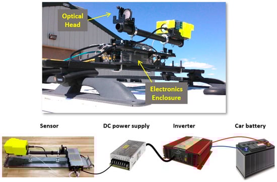 (Top): Photograph of sensor vehicle roof mount. (Bottom): Pictorial view of components used to power the sensor for vehicle deployments.