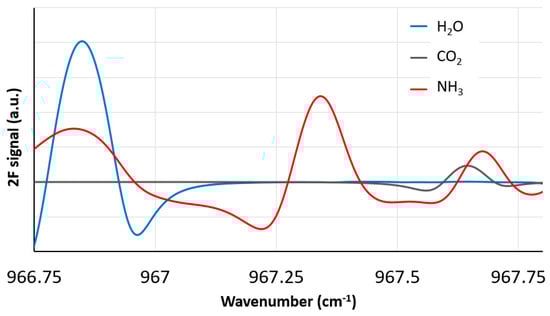 The ammonia sensor is based on WMS detection via the strongest absorption line of ammonia in mid-infrared (MIR) spectral region (the Q branch of v2 bending band) [31,32]. At ambient pressure and temperature there is a very isolated (free from other species) absorption feature at 10.337 µm (967.35 cm−1) due to the rotational transition . The WMS technique has been described in detail previously [24,28,33,34,35], and here, we focus on elements specific to our implementation. WMS is fundamentally a laser absorption technique, where species concentrations are inferred through the Beer-Lambert Law, similar to direct absorption spectroscopy (DAS). One of the drawbacks of DAS is that its sensitivity is limited by low frequency noise in the signal, which originates mainly from the laser and detector noise. Also, in open-path configurations at atmospheric pressure, the absorption features are often not fully isolated such that determining the background (absorption-free baseline) signal can be challenging. These issues are addressed in WMS by modulating the laser wavelength (typically through laser current) at a relatively high frequency (typically ~10 kHz). This fast modulation is superimposed on the slower wavelength scan ramp (typically ~1–100 Hz) that serves to wavelength scan over the transitions absorption feature (as in regular DAS). The fast modulation, when combined with phase-sensitive (lock-in) detection, moves the measurement into a higher frequency regime where laser and detector noise (usually described by 1/f noise, or flicker noise) are greatly reduced thereby yielding higher signal-to-noise.