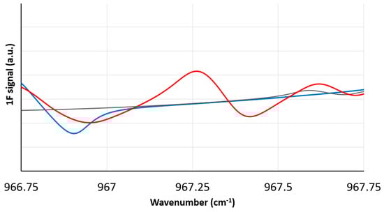 Another important feature of WMS is that it is a “derivative” technique, meaning that the 1f and 2f signals (i.e., the first and second harmonic signals found from the lock-in) closely resemble the first and second derivatives of the absorption spectrum. Measurements are therefore sensitive to spectral absorption shape or curvature rather than absolute absorption levels. This feature is particularly helpful for measurements in atmospheric pressure (or above) with non-isolated absorption features. For a robust measurement approach that is immune to laser power fluctuations (and atmospheric induced fluctuations, e.g., dust which can weaken the beam), appropriate signal normalization schemes can be used. Past research has shown that normalizing the 2f signal by the 1f signal is effective in this regard [28,33,34,36], and we follow such an approach.