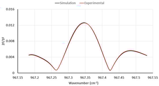We first illustrate the workings of our WMS implementation by showing an example of a specific measurement simulation and result with gas delivered from a reference cylinder through a closed-cell cavity. Figure 5 shows a comparison of the WMS spectrum (2f amplitude normalized by 1f, i.e., R2f/R1f) for the case of NH3 concentration of 150 ppb (for P = 0.84 atm, T = 295 K, and L = 1988 cm for our multi-pass cell). The figure illustrates the scan range used in actual experimental measurements and shows an example of the data quality. One can see that there is excellent agreement in the peak amplitude and overall spectral shape, showing the validity of the assumed methods.