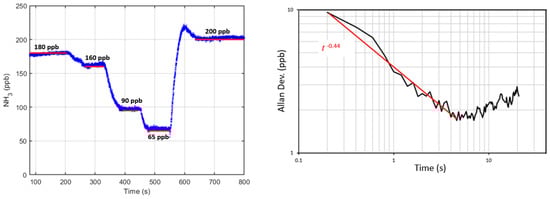 (Left): Comparison between measured and expected ammonia concentrations with closed-path configuration Red bars show the fix delivered concentrations. (Right): Allan variance analysis shows the sensitivity of ~4 ppb (at 1 s).