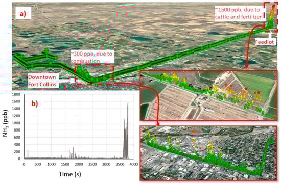 (a) Concentration data imported and viewed in Google Earth. (b) Ammonia concentration time series from the same data (~1 h measurement).
