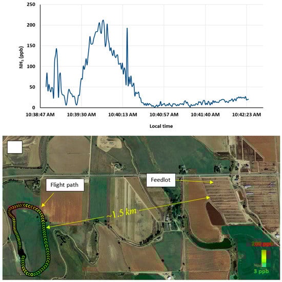 (Top) The aerial view of the flight path and the feedlot. (Bottom) The measured ammonia concentration timeseries.