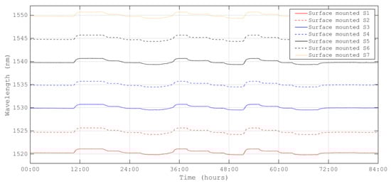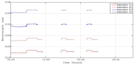 | Sensor | Temperature (°C) | Surface Mounted (με) | Embedded (με) | Difference (με) |