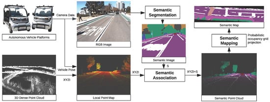 Probabilistic mapping builds a map that maximizes the likelihood of the map under the data []. Thrun et al. [] build a probabilistic map by modeling the occupancy probability with expectation maximization. Their work and many other works [,] address simultaneous localization and mapping (SLAM), while our work focuses only on the mapping of semantic attributes. Semantic maps have been utilized successfully in the areas of localization [,] and the prediction of pedestrian motion []. This approach is advantageous because it enables the representation of inherent distribution information within a discrete space while simultaneously filtering out noise. Our current work builds on this technique by applying it to the creation of semantic maps while additionally incorporating prior information from LiDAR’s intensity channel. As a result of this integration, we can generate semantic maps that are more stable given potentially noisy semantic images.
