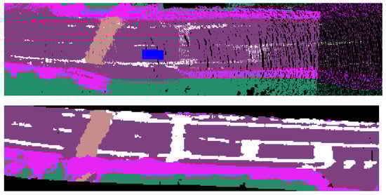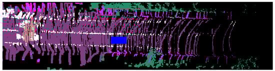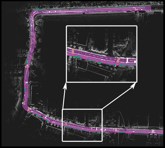 In a related study, Maturana et al. [] combine semantic imagery captured by a camera with LiDAR point clouds. They rely on raw point clouds in real time from a 64-channel LiDAR, which provides more dense real-time information at a higher cost. Our approach, however, can build a map from a relatively cheaper 16-channel LiDAR. Moreover, their research concentrates on off-road environments, whereas our research focuses on urban driving scenarios. In such settings, certain traffic rule-related categories, like crosswalks and lane markings, require higher attention.