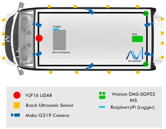 We collected our experimental data using one of our autonomous cars, as described in []. This car is equipped with a 16-channel LiDAR and six cameras, arranged with two cameras on the front, one on each side, and two on the back, as depicted in Figure 4. We recorded data from the front left camera, LiDAR, and vehicle position by driving through the UC San Diego campus. The camera data was streamed at approximately 13 Hz, while the LiDAR scans were performed at approximately 10 Hz. By driving through the campus, we were able to gather data for various urban driving scenarios, including challenging situations such as navigating steep hills, intersections, and construction sites.