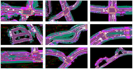 Some researchers have also explored methods to create semantic maps of the environment, including [,,]. However, these approaches either rely on aerial imagery/high-cost sensors to extract road information, which can limit the availability of data, or they do not explicitly map lane and crosswalk information, which are crucial for HD map generation.