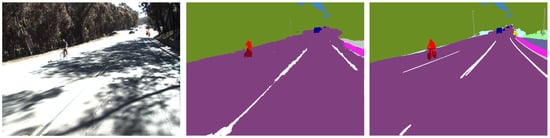 Another notable issue is the consistency of labels across the dataset used for both semantic segmentation networks. As we mentioned in Section 4.3.1, the Mapillary dataset [] irregularly fills the dash lanes. For example, as shown in Figure 12 we can see dashed lanes being turned into solid lines in the first example, and in the second example a more complicated zebra-style lane region turned into a fully solid lane label. In the third example, however, the dashed line stays dashed.