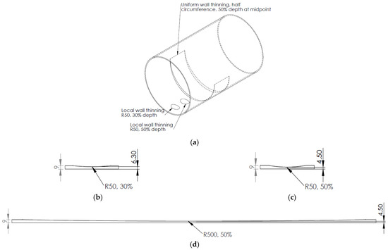 A 3D view of the pipe segment (a); cross-sectional images of the defects: localized corrosion with a depth of 30% (b) and 50% (c) of initial wall thickness; and uniform corrosion with a thickness loss reaching 50% of the initial wall thickness at the midpoint (d).