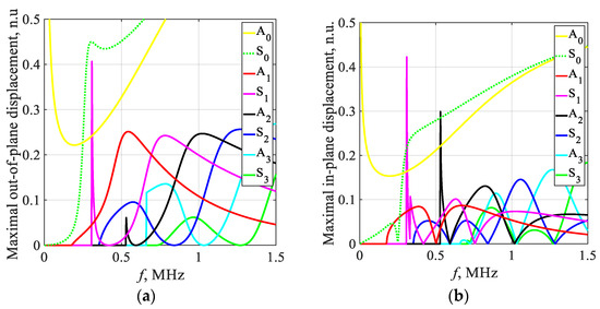 Maximal displacement vs. frequency: (a) out-of-plane; (b) in-plane.