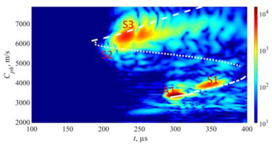 In Figure 5, the results of the inspection at a defect-free location are presented. The S3, A1, and S1 wave modes are clearly visible, each exhibiting distinct and identifiable phase velocity ranges. The weak fingerprint of the S2 mode can also be observed. In our previous paper [37], it was demonstrated that both S3 and A1 modes at f × d of 9 MHz × mm can be effectively used for detecting uniform and concentrated wall-thinning defects as these modes have relatively short wavelengths, low attenuation, and can be employed for inspecting water-filled pipes using conventional ultrasonic phased arrays. In this case, we also took into account other co-existing modes such as S1 and S2, as they are expected to offer supplementary information for defect detection and classification. However, it is important to note that the S1 mode has higher leakage losses compared to the S3 and A1 modes. Therefore, increasing the inspection distance may result in the absence of the S1 mode.