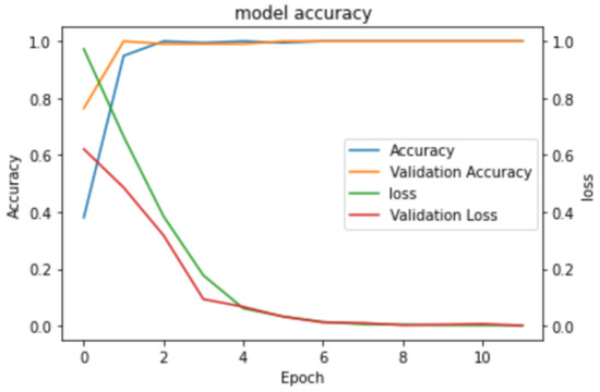 The accuracy results in Figure 18 for the VGG16 neural network model presents a clear progression of improvement over the course of training. At epoch 0, the model had an accuracy of 0.4 and a validation accuracy of 0.75, with a loss of 0.98 and a validation loss of 0.63. By epoch 2, both the accuracy and validation accuracy reached values near 1, while the loss dropped to 0.45 and the validation loss to 0.35. Continuing this trend, at epoch 4, the accuracy and validation accuracy remained near 1, and the loss and validation loss further decreased to approximately 0.1. At epoch 6, the model maintained its near-perfect accuracy and validation accuracy, with both the loss and validation loss values approaching 0.01. The model exhibited good performance on both the training and validation sets, while learning curves showed no significant gap between the training and validation curves, indicating that it was not overfitting. Additionally, to prevent overfitting, stop criteria was used, and model training stopped at the 11th epoch as no further improvements were observed in the subsequent five steps. The VGG-16 model was trained for a total of 19 min until convergence.