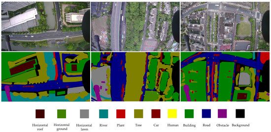Images and labels from the UAV-City dataset are provided as examples. The photographs obtained by the UAV are shown in the first row. The ground truth labels are shown in the second row.