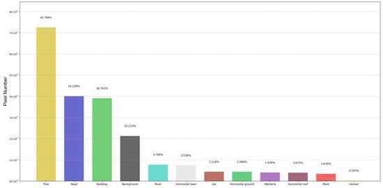 Our dataset contains 600 images of different scenes, which were annotated pixel by pixel using the LabelMe tool. Each image has a resolution of . The dataset is divided into training, validation, and test sets according to an 8:1:1 ratio. Figure 4 shows the pixel counts of each class (including the background) in the UAV-City dataset. It clearly shows the distribution of imbalanced pixel counts among different classes. Most of the pixels come from the tree, road, and building classes. Classes such as car, horizontal roof, horizontal ground and horizontal lawn, river, obstacle, and plant contribute fewer pixels, accounting for less than 5% of the total pixels. For the human class, it occupies only 0.103% of the pixels, which is due to the relatively low number of pixels per instance in the UAV-City dataset. Among them, the car and human classes are small objects, which have fewer total pixel points and smaller sizes. Therefore, segmenting small objects poses a great challenge in semantic segmentation tasks.