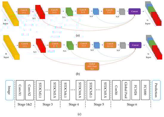 The STDC network. (a) Stride = 1; (b) stride = 2; (c) shows the General STDC Network architecture. The operation denotes Conv-BN-ReLU.