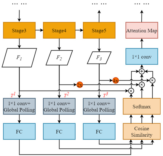 In particular, we set the feature maps generated by Stages 3 to 5 as the templates, denoted as , as illustrated in Figure 7. Then, the template layer was passed through a convolutional layer with the dimension reduced to 1. The maximum value of the feature map was then generated through global max pooling, i.e., the most noteworthy feature pixels were captured; they were mapped to vectors for cosine similarity computation through a fully connected layer: