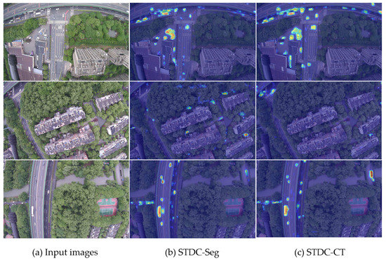 Comparison of Grad-CAM between STDC-CT and STDC-Seg on the UAV-CITY dataset.