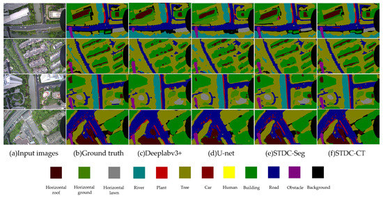 The NVIDIA TensorRT inference acceleration library was utilized to maximize GPU resource utilization on the TX2. We configured JetPack 4.5.1 and CUDA 10.2 on the NVIDIA TX2, and set up the experimental environment with PyTorch 1.9.1. Then, we deployed the trained models on the TX2 for real-time segmentation testing in the UAV-City dataset scenarios, with each image input size set to . Table 9 presents the inference speeds of various models for predicting a single image. The experimental results show that our proposed STDC-CT model achieves an average inference speed of only 58.32 ms on the TX2, effectively meeting the real-time segmentation demands in real-world environments.